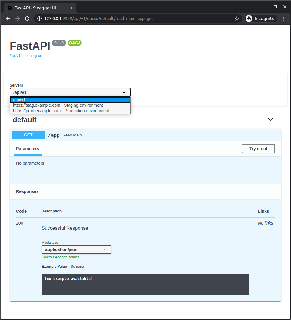 Notice the auto-generated server with a url value of /api/v1, taken from the root_path.